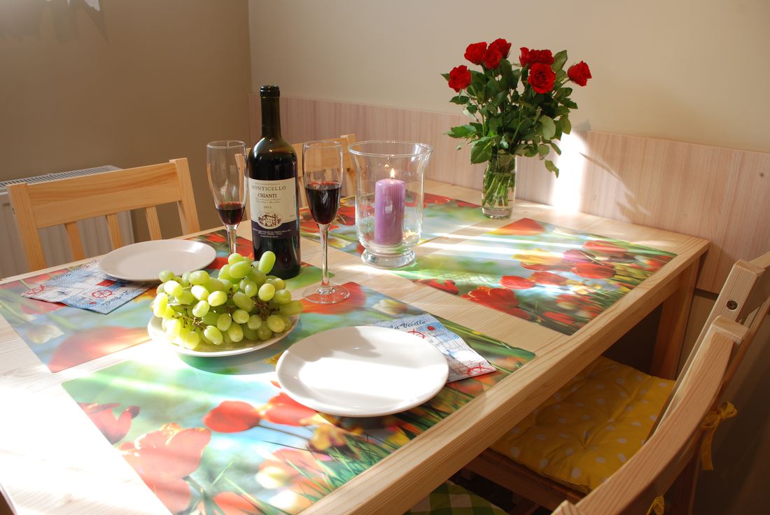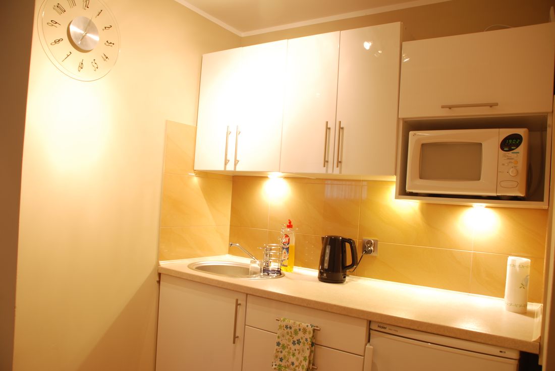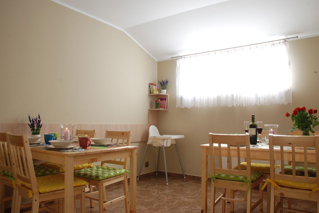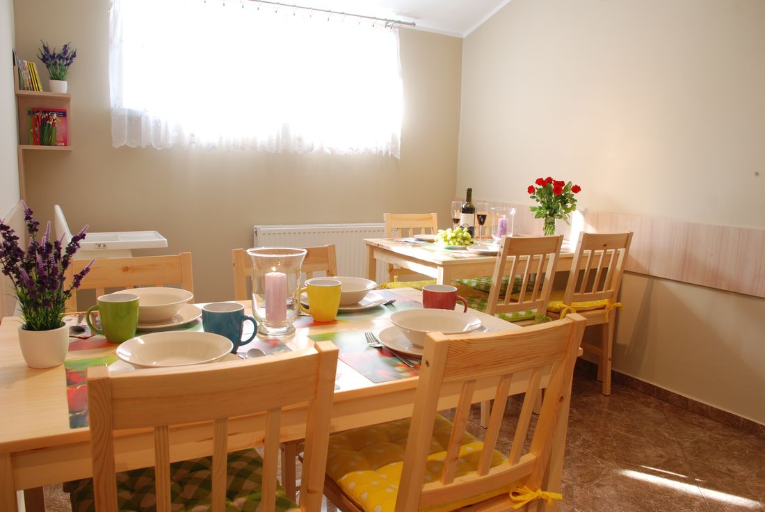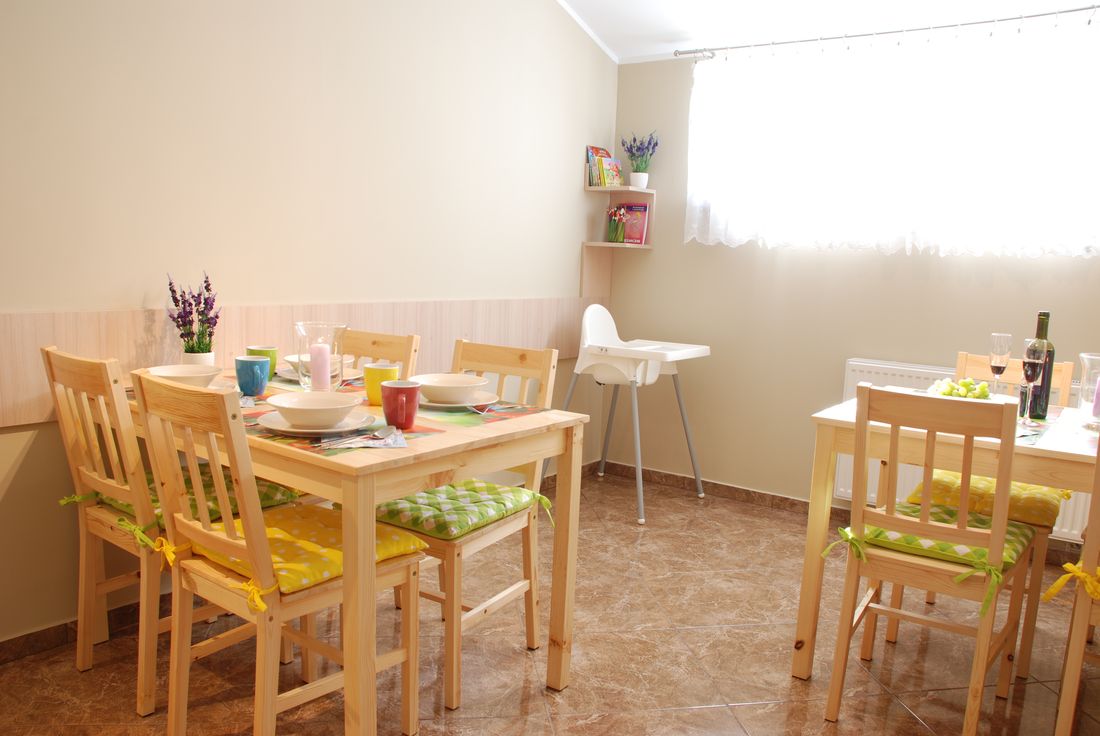 Do Państwa dyspozycji oddajemy aneks kuchenny, który jest dostępny dla wszystkich gości. Wyposażony jest w zlew jednokomorowy, kuchenkę mikrofalową, czajnik elektryczny, lodówkę z zamrażarką, naczynia, sztućce. Do asortymentu pomieszczenia nie wlicza się kuchenka do gotowania. Znajdują się tu 2 duże stoły z krzesłami, przy których będą mogli Państwo spokojnie spożyć drobny posiłek. Dla najmłodszych przygotowaliśmy krzesełko do karmienia oraz ciekawe książeczki.