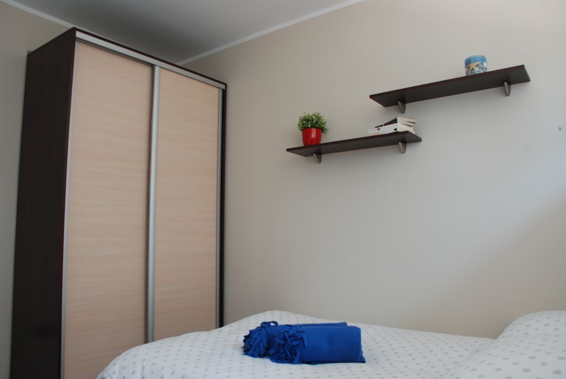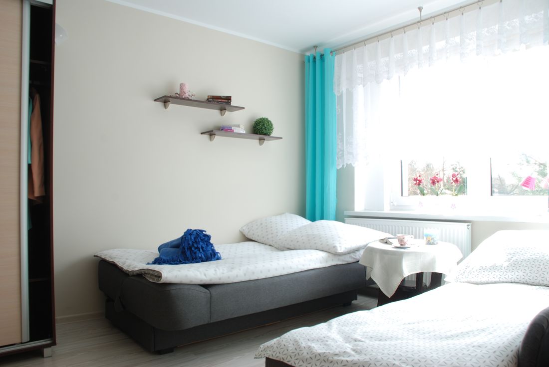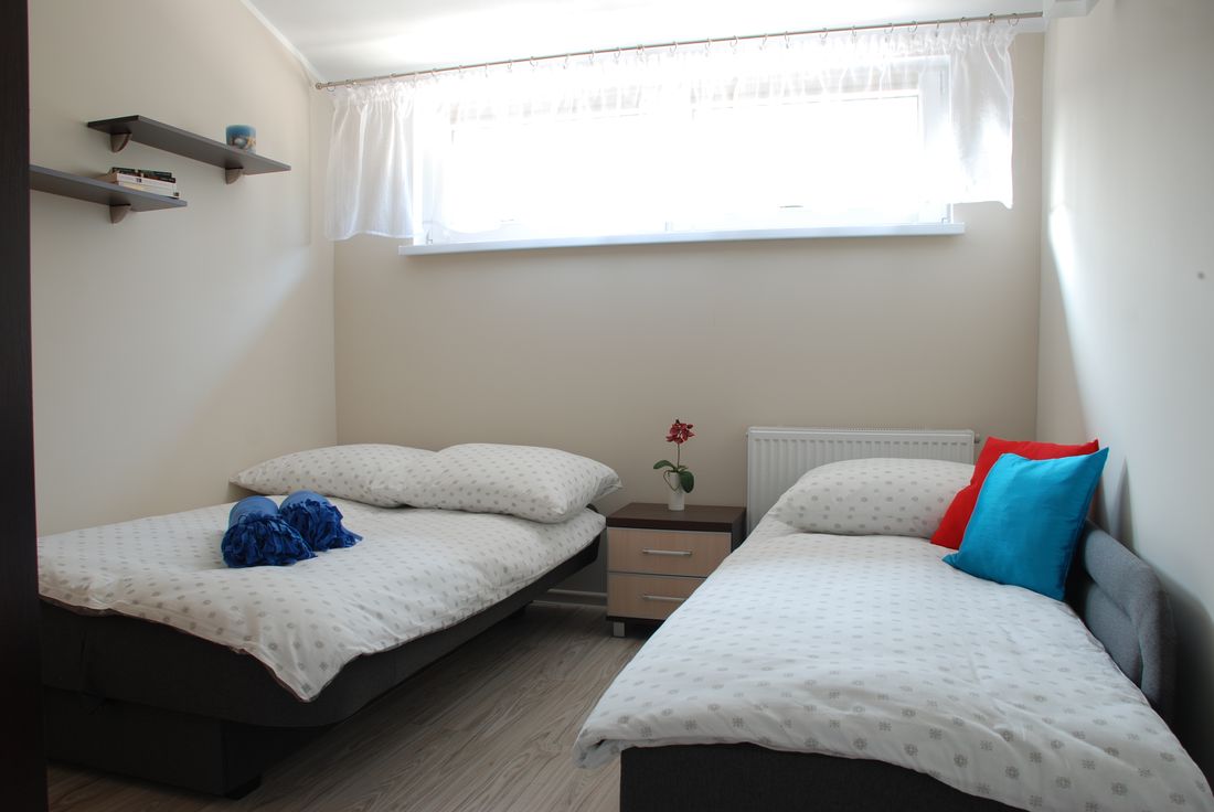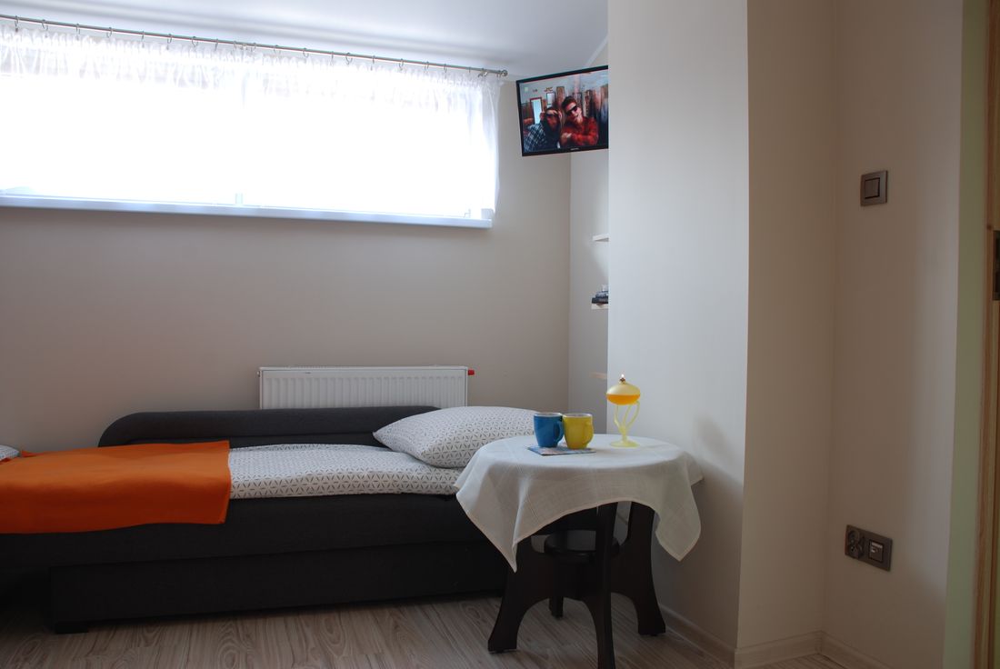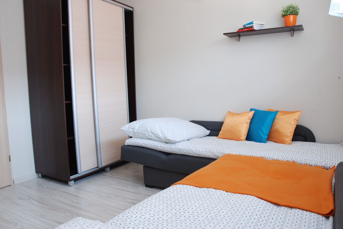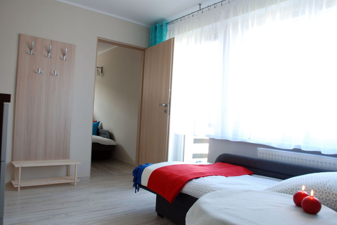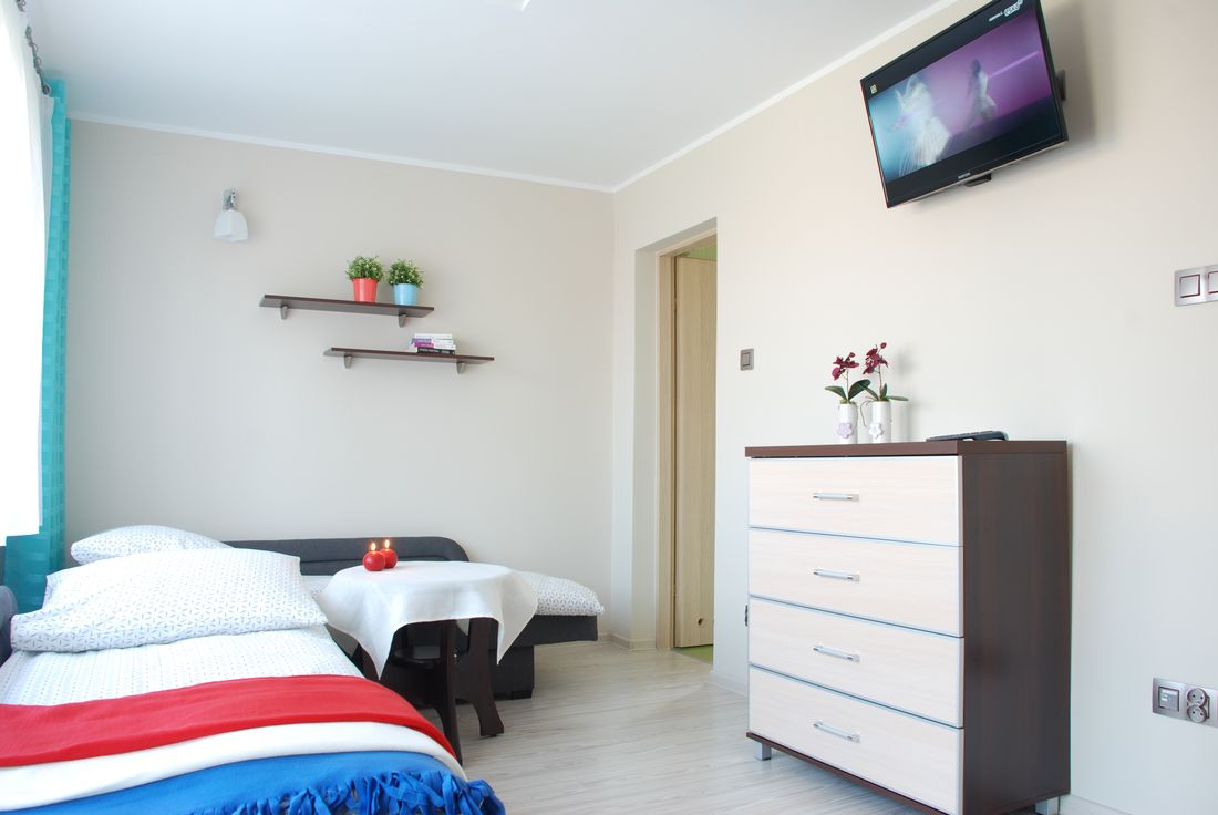 Apartament składa się z 2 pokoi oraz obszernej łazienki. W sypialni znajdują się: 1 łóżko jednoosobowe oraz 1 rozkładane łóżko typu wersalka, na którym mogą spać wygodnie dwie osoby. Kolejnym atutem jest duża szafa, która pomieści wszystkie Wasze rzeczy. Pokój wyposażony jest również w stolik nocny oraz wiszące półki na drobiazgi.