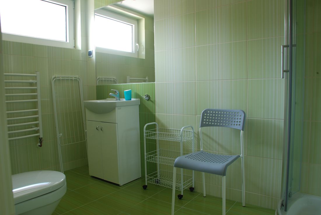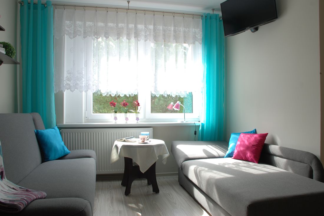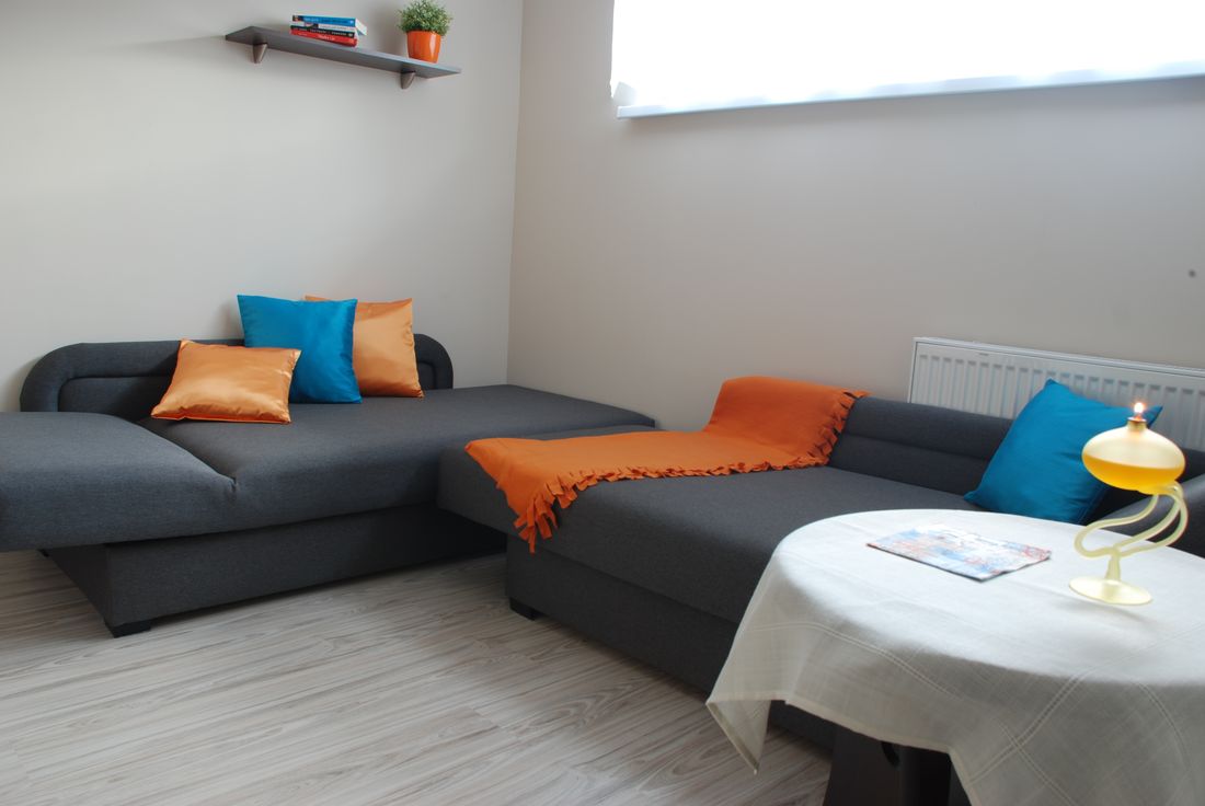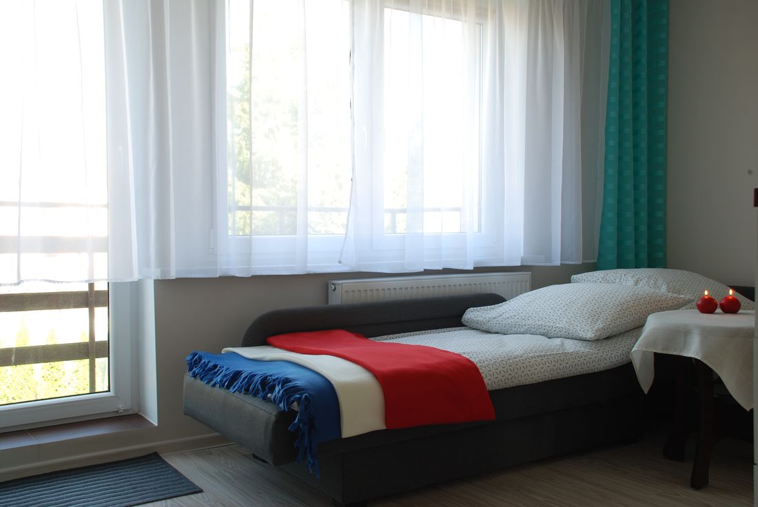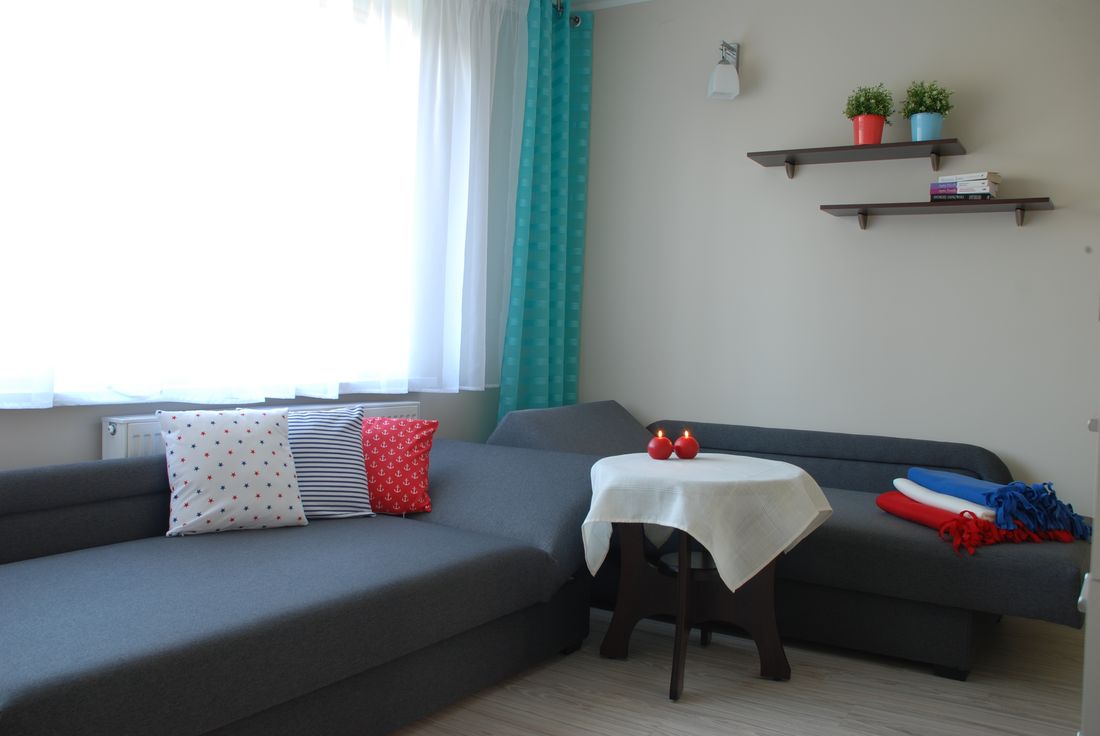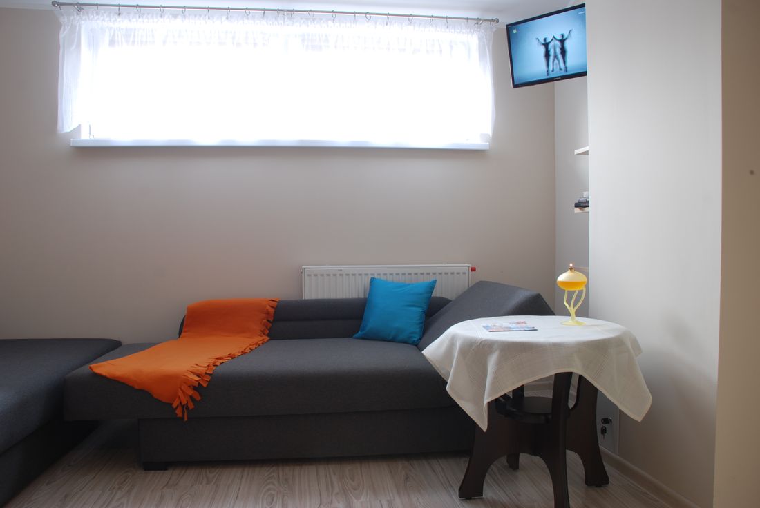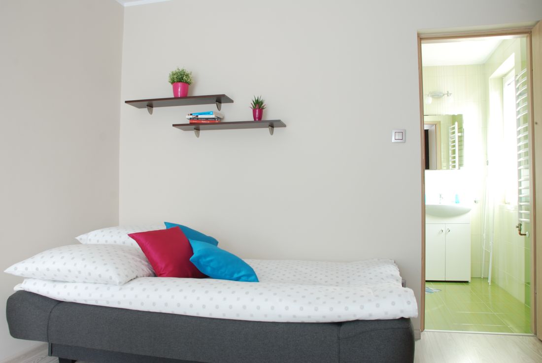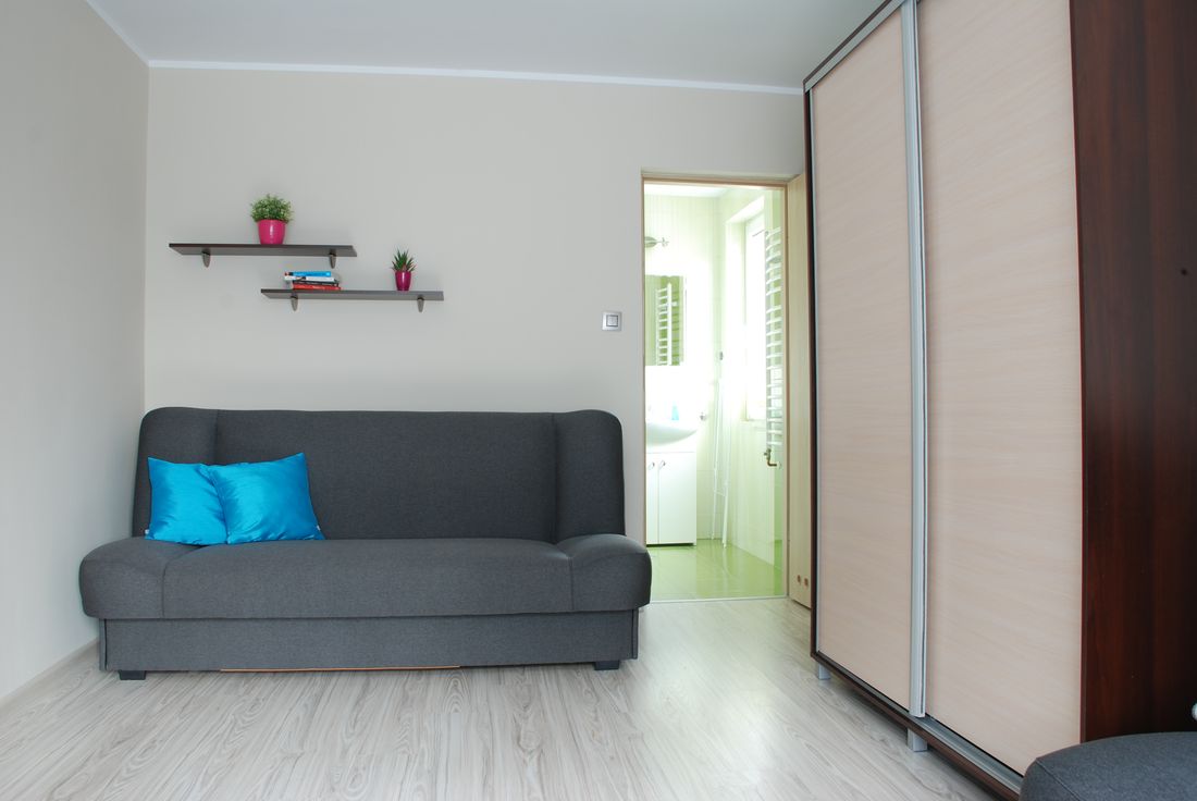 Apartament składa się z 2 pokoi oraz obszernej łazienki. W sypialni znajdują się: 1 łóżko jednoosobowe oraz 1 rozkładane łóżko typu wersalka, na którym mogą spać wygodnie dwie osoby. Kolejnym atutem jest duża szafa, która pomieści wszystkie Wasze rzeczy. Pokój wyposażony jest również w stolik nocny oraz wiszące półki na drobiazgi.
