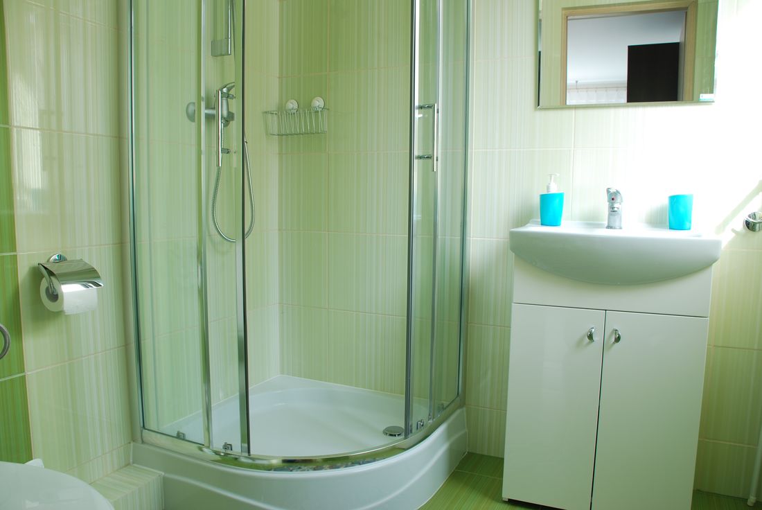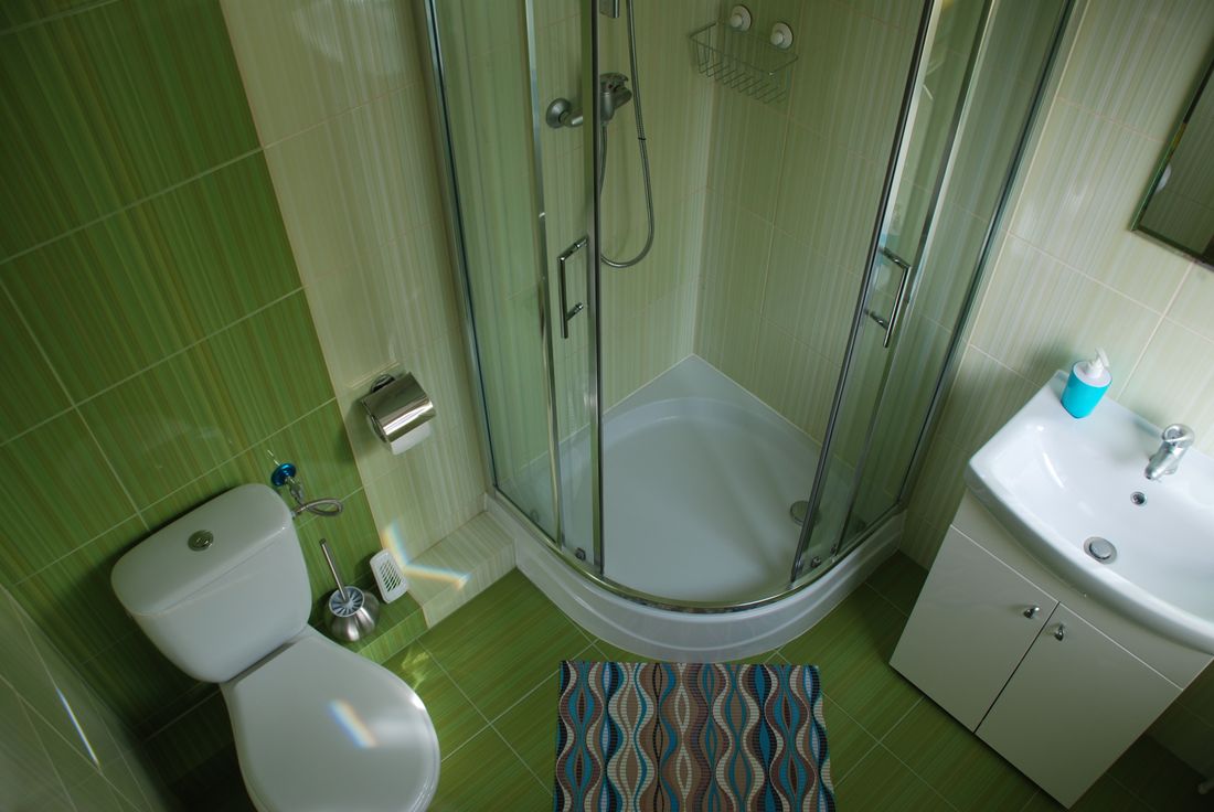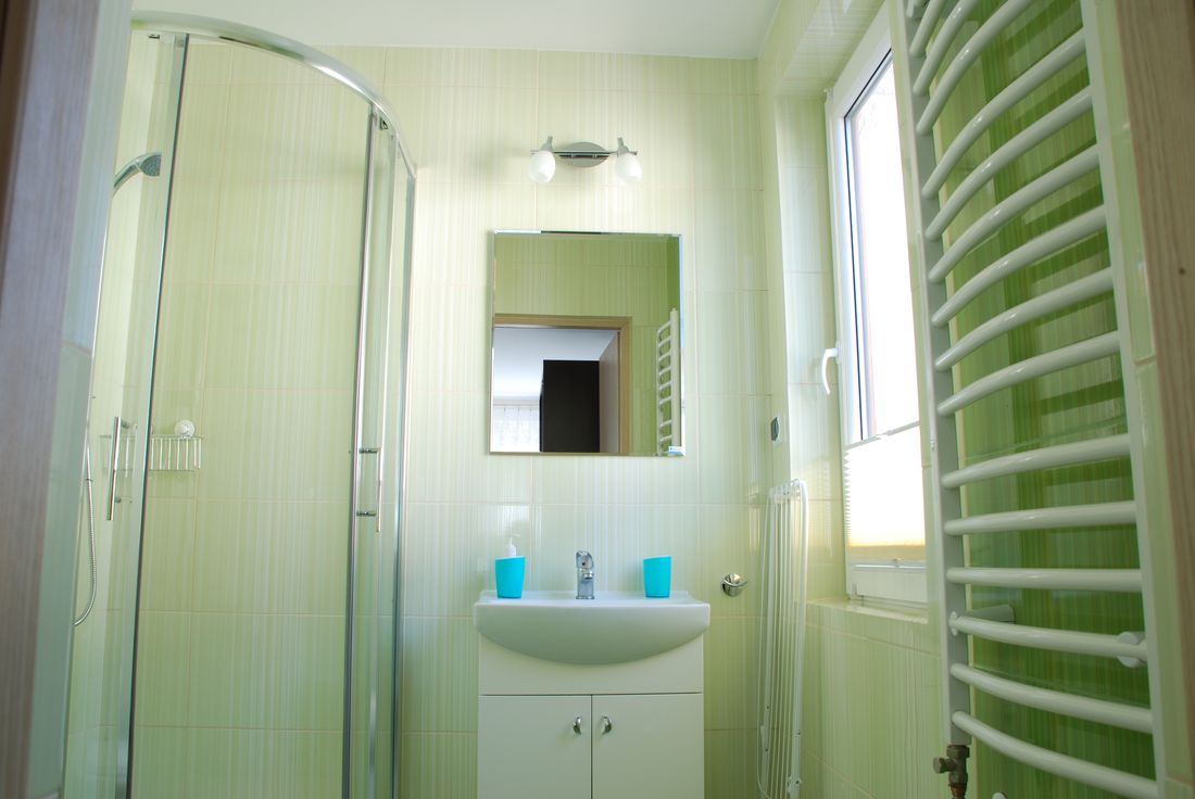 Obszerna łazienka wyposażona jest w kabinę prysznicową, 2 umywalki z szufladami i toaletę. Dodatkowo znajdziecie w niej stojącą szafkę oraz suszarkę na odzież.
